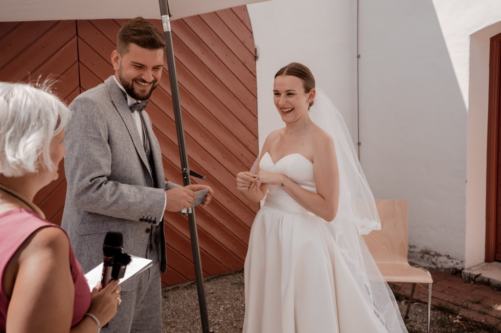Diesen Wunsch trug ich die nächsten Jahre mit mir herum und habe immer wieder meinen Freund:innen davon erzählt. So kam es dann auch, dass meine Freundin Laura mich im Sommer 2021 fragte, ob ich im August 2022 ihre Traurednerin sein würde. Darauf gab es natürlich nur eine Antwort: Ja. Von da an ging es ans Recherchieren, Überlegen und gemeinsam eine Trauung ausarbeiten, die für sie und ihren Mann stimmig war.